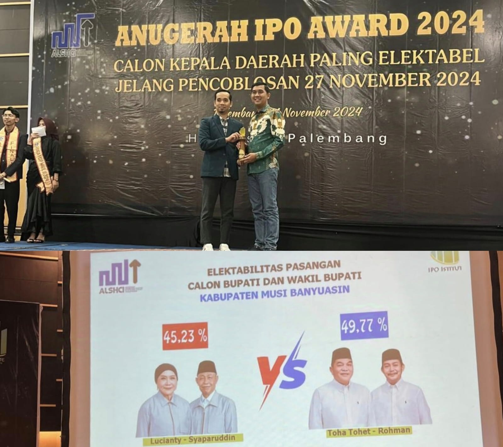 lintaspost.co.id,,Toha-Rohman raih penghargaan IPO Award dari Lembaga Survey Indonesia Public Opinion (IPO) Institute, kamis (21/11/24) pukul 20.00 WIB di Hotel Aston Palembang.