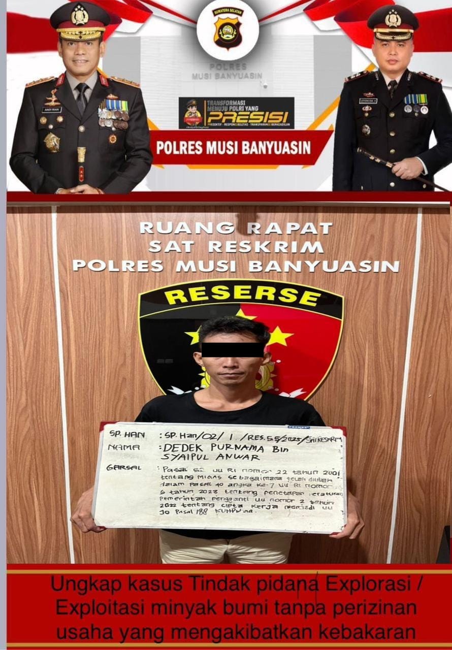lintaspost.co.id,,MUBA– Dedek Purnama (33), seorang warga Kelurahan Balai Agung, Kecamatan Sekayu, kini harus mempertanggungjawabkan perbuatannya. Ia ditangkap oleh Polsek Keluang atas dugaan sebagai pemilik dan pengelola sumur minyak ilegal yang terbakar di Dusun IV Desa Tanjung Dalam, Kecamatan Keluang, pada Selasa, 31 Desember 2024, malam.