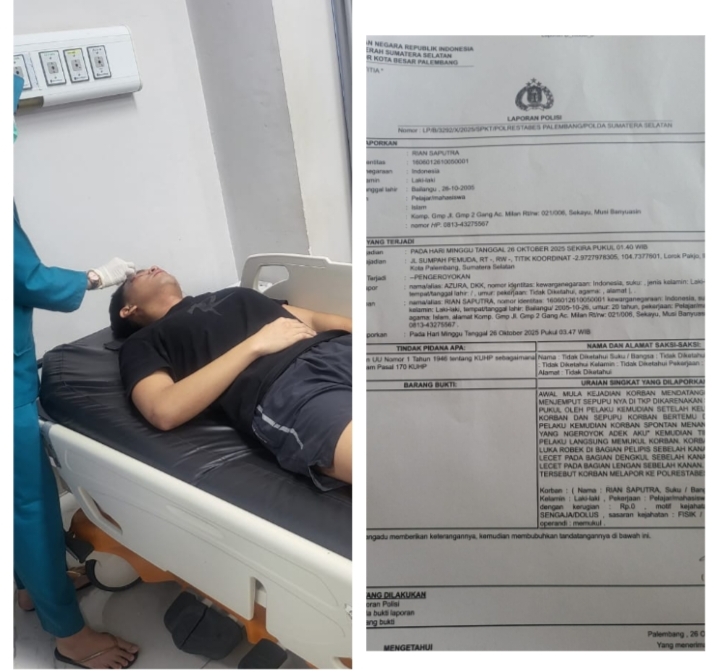 Para pelaku saat ini telah dilaporkan ke Polrestabes Palembang.kasus pengeroyokan yang menimpa Rian Saputra (20) terjadi di salah satu cafe yang berada di Jalan Sumpah Pemuda Kota Palembang pada Minggu 26 Oktober 2025 pukul 01:40 Wib.