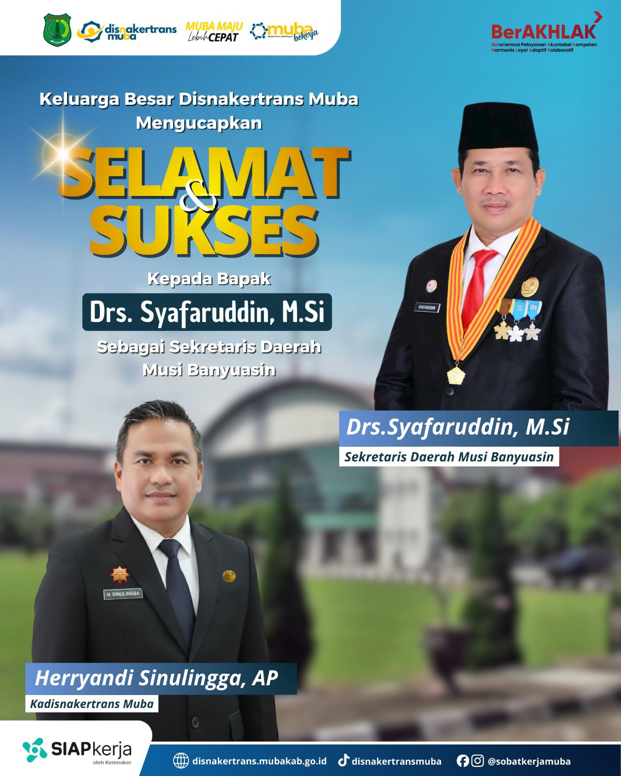 “Selamat dan sukses atas amanah yang dijalankan Bapak Syafaruddin. Beliau kini menjadi Panglima dan Komando ASN kita. Kami Disnakertrans Muba siap bersinergi di bawah komando beliau untuk menggerakkan seluruh lini guna mewujudkan Muba Maju Lebih Cepat dan masyarakat yang lebih sejahtera,” ujar Sinulingga .
