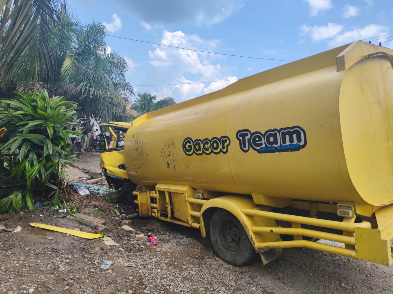 Kejadian tersebut melibatkan mobil jenis tangki bermerek “Team Gacor” yang membawa minyak hasil Illegal Refinery dari Kabupaten Musi Banyuasin dan satu Bus Pariwisata.